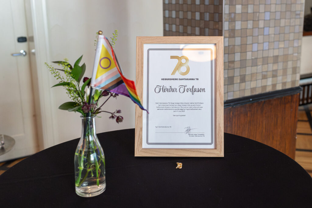 Laugardaginn 17. maí 2025 var Hörður Torfason sæmdur heiðursmerki Samtakanna ‘78 við hátíðlega athöfn á Hótel Borg. Margt var um manninn og mikil gleði og þakklæti í loftinu. Um tónlist sáu Elijah Kristinn Tindsson, sigurvegari söngkeppni Samfés 2025, og Egill Andrason, píanóleikari.